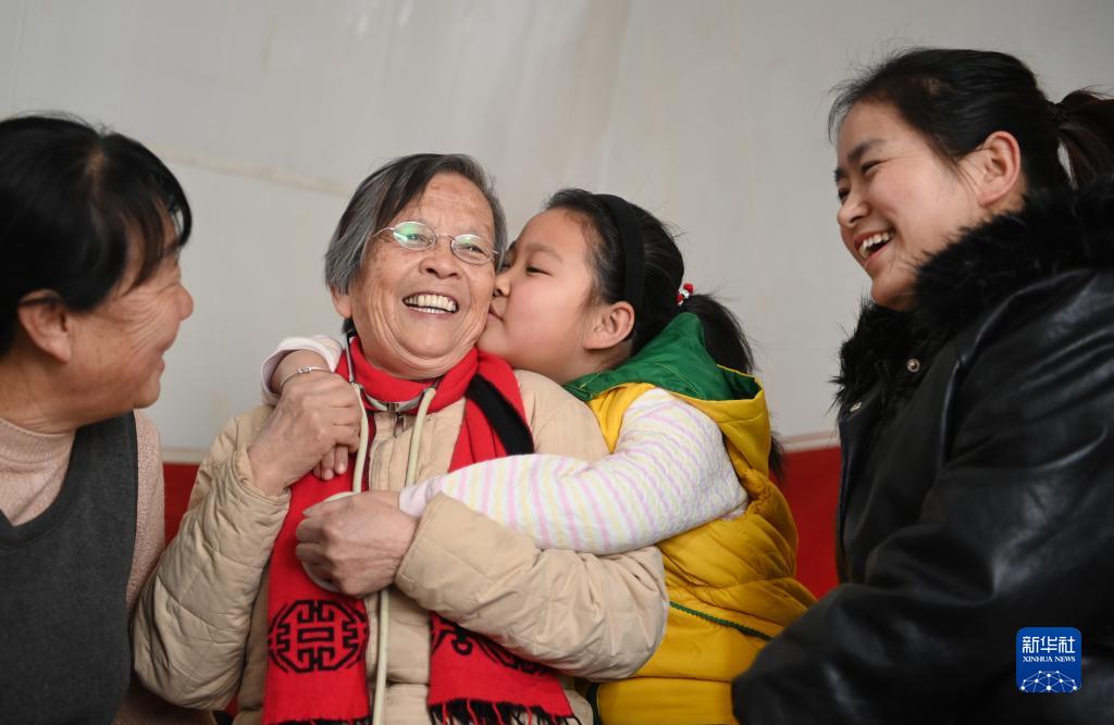 路生梅(左二)在陕西佳县佳州街道凌云社区义诊时,张宇旋亲密拥抱她(2021年1月17日摄)。张宇旋的妈妈(右一)、奶奶(左一)都曾让路生梅看过病。新华社记者 陶明 摄