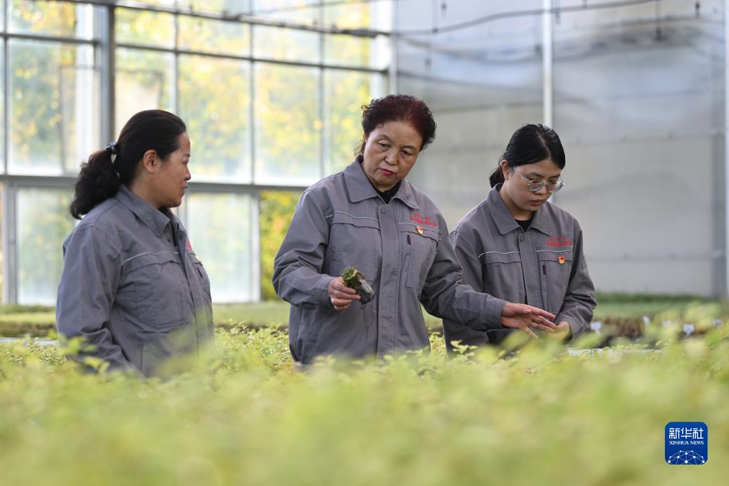在青海省西宁市林业科学研究所的温室内,张锦梅(中)与同事在查看种苗(9月14日摄)。新华社记者 张龙 摄